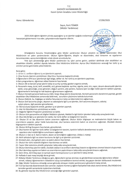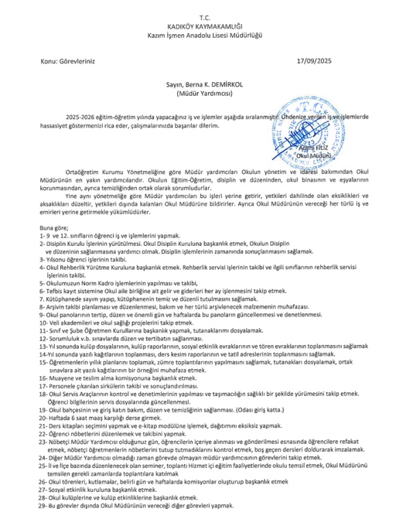 2025-2026 Eğitim öğretim yılında okul müdür yardımcılarımızın göre vdağılımları aşağıdaki gibidir.