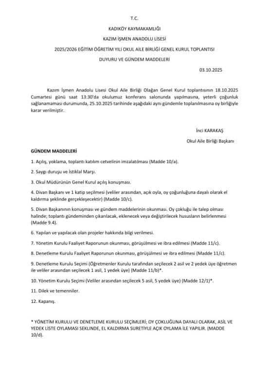 Kazım İşmen Anadolu Lisesi Okul Aile Birliği Olağan Genel Kurul toplantısı 18.10.2025 Cumartesi günü saat 13.30'da okulumuz konferans salonunda yapılacaktır.